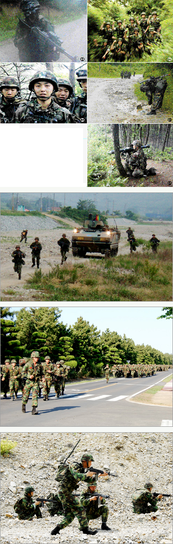[첫번째]폭우와 안개 속에 숨은 대항군 찾기:이번 훈련은 100mm에 가까운 폭우와 짙은 안개 속에서 실시돼 실전감을 더했다. 해병대1사단 31대대 병사가 야시 장비를 끼고 폭우와 안개 속에 숨은 대항군을 찾고 있다①. 마지막까지 분투했던 31대대 3중대 장병들②과 전사 판정을 받은 후 눈물을 흘리는 장병들의 표정③에서 승리에의 갈망이 느껴진다. 도로에 대전차지뢰를 정성스럽게 매설하는 병사④와 숲속에서 팬저파우스트 대전차 로켓으로 대항군 전차를 겨냥하는 해병대 병사⑤가 꿈꾸는 것은 오로지 승리다. 사진=육군과학화전투훈련단 제공