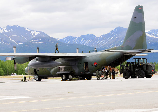 지난달 8일부터 한 달여 동안 미 공군 엘멘도프 기지에서 열린 레드 플래그 알래스카 훈련에 참가한 공군 전술공수팀이 임무 수행을 위해 C-130 수송기에 화물을 적재하고 있다. |