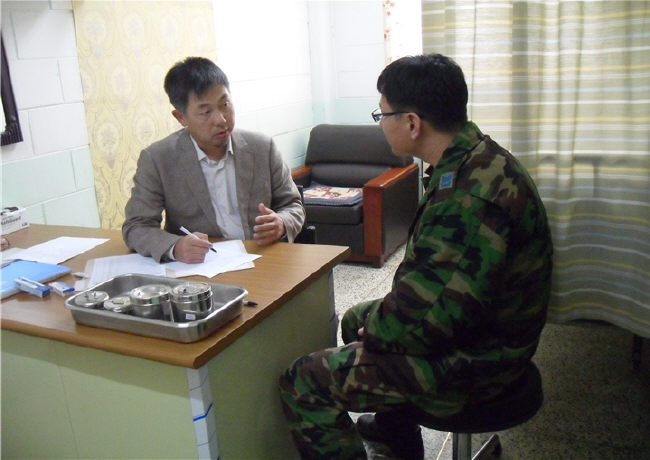 | 강형철(왼쪽) 원장이 공군15혼성비행단 부사관을 대상으로 피부과 진료를 하고 있다. |