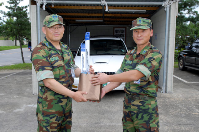 부대가 운영하는 자동차 쉼터는 타이어 공기압이 연비에 큰 영향을 미친다는 사실에 착안해 차량의 자가 점검과 타이어 공기주입을 할 수 있도록 마련한 시설. 쉼터의 2000번째 이용자인 이능교(중령) 관리처장은 수송대대로부터 워셔액와 와이퍼를 기념품으로 전달받았다.