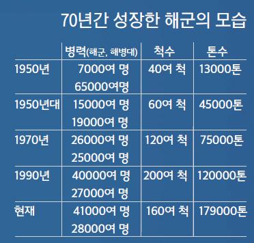 해군은 지난 70년간 국민의 후원과 함께 어려운 여건 속에서도 피나는 노력을 통해 큰 성과를 거두며 발전해 왔다. 1945년 70명의 해방병단으로 출발한 해군은 현재 7만여 명에 가까운 해군·해병대로 성장했다. 영해수호는 물론 해외파병지와 세계 곳곳에서 선진국 해군과 어깨를 나란히 하며 전 세계를 활동 무대로 활약을 펼치고 있다.