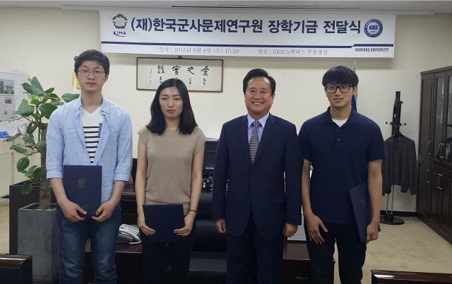 한국군사문제연구원(원장 이명구)은 8일 한양대학교 ERICA 캠퍼스(이하 한양대)에서 ‘2016년 KIMA 호국장학금 전달식’을 가졌다. 지난해 시작된 장학금 전달식은 어려운 여건 속에서도 성실히 임무를 다하고 있는 장기복무 현역 및 예비역 자녀에게 도움을 주자는 취지에서 마련됐다. 장학생 선발은 매년 한양대에서 진행하며, 20년 이상 장기복무 현역 및 예비역 자녀로서 성적 평점 3.0 이상, 학부장의 추천을 받은 학생을 대상으로 하고 있다.