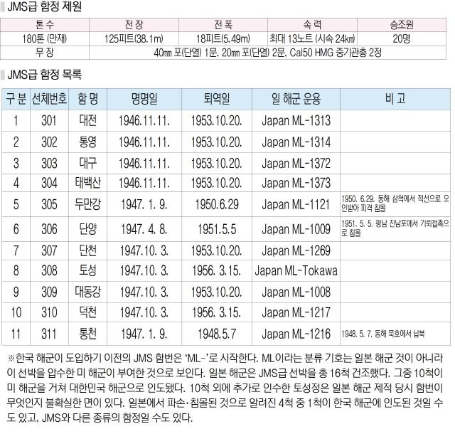 JMS급 함정은 1948년 10월 19일 여수에 주둔하던 육군 제14연대의 남로당계 장병들이 북한 공산세력의 지령에 따라 일으킨 ‘여수·순천사건’을 진압하는 작전에 투입돼 큰 공적을 세웠다.