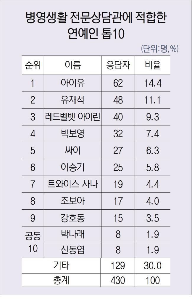 조사 결과 1위는 가수 겸 배우 아이유(62명, 14.4%)가 차지했다. 장병들은 유년 시절 어려운 환경을 딛고 최고의 아티스트가 된 후에도 초심을 잃지 않고 항상 열심인 아이유라면, 친누나처럼 따뜻하게 보듬어 주고 무슨 이야기든 공감해 줄 것 같다고 입을 모았다.