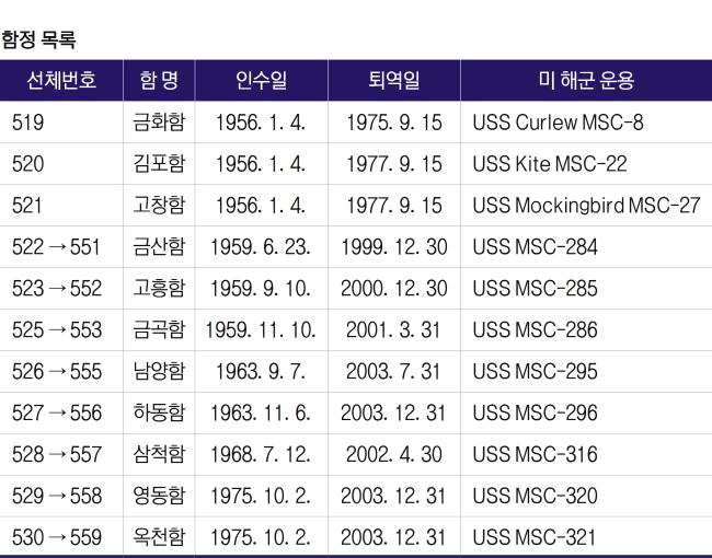 우리 해군은 1956년부터 1975년까지 미 해군으로부터 MSC(Minesweeper Coastal)급 연안소해함 11척을 도입했다. 이 함정들은 2000년대 초반까지 기뢰전(Mine Warfare) 핵심 전력으로 운용됐다.