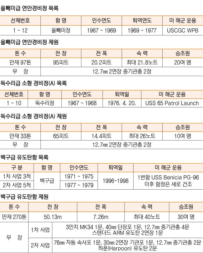 우리 해군은 1960년대 후반부터 1970년대까지 미국 해군과 해안경비대에서 고속 기동이 가능한 소형 함정을 다수 도입했다. 올빼미급 연안경비정(PB·Patrol Boat)과 독수리급 고속정(FB·Fast Boat), 백구급 유도탄고속함(PGM·Patrol Ship Guided Missile Medium)이 주인공이다. 이 함정들은 작지만 빠른 속력을 자랑해 조류 이름을 함명으로 부여받았다. 특히 국산 건조 함정이 등장하기 전까지 해군의 유일한 연안 전력으로 한반도 전 해역에서 활약했다.