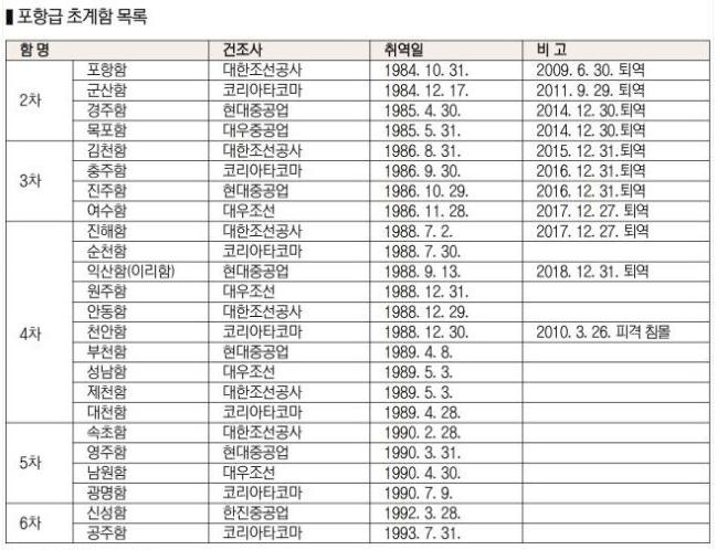 2차 사업으로 건조한 초계함은 4척이다. 이들 함정은 1984년 10월부터 이듬해 5월까지 순차적으로 취역했다. 포항함·군산함·경주함·목포함이 주인공이다. 이어 1993년 7월 6차 사업까지 김천함·충주함·진주함·여수함(3차), 진해함·순천함·익산함·원주함·안동함·천안함·부천함·성남함·제천함·대천함(4차), 속초함·영주함·남원함·광명함(5차), 신성함·공주함(6차)이 취역했다.