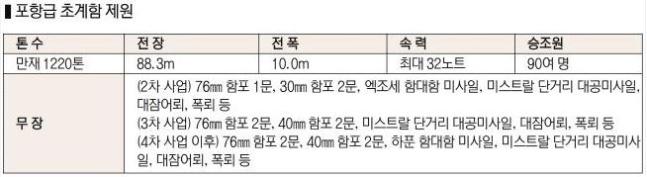 기본설계는 동해급과 차별화했다. 1차 사업인 동해급은 외형이 ‘항아리’ 형태였지만 2차 사업(포항급)부터는 울산급 호위함(FF·Frigate)과 유사한 선형으로 건조했다. 포항급은 동해급보다 전장이 10m 길어지고, 톤수는 100여 톤이 증가했다. 함정의 안정성을 끌어올리기 위한 안정기(Stabilizer)도 탑재했다.