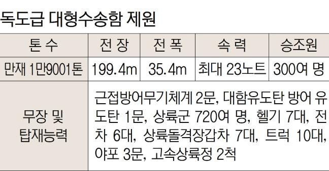 해군의 첫 번째 대형수송함은 2005년 7월 12일 진수됐다. 해군은 독도 수호 의지를 담아 함명을 ‘독도’로 부여했다. 전장 199m, 전폭 35m의 독도함은 1만4500톤급으로 당시 아시아 최대 규모를 자랑했다. 4기의 디젤엔진은 최대 23노트(시속 43㎞)까지 속력을 낼 수 있다. 탑재 능력은 상륙군 720여 명, 헬기 7대, 전차 6대, 상륙돌격장갑차 7대, 트럭 10대, 야포 3문, 고속상륙정(LSF-Ⅱ·Landing Ship Fast) 2척 등이다.