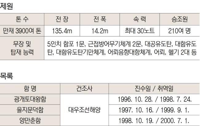 광개토대왕급 구축함은 1995년 ‘대양해군’을 기치로 내걸었던 우리 해군의 상징과도 같은 존재였다. 광개토대왕함은 동해에서, 을지문덕함은 서해에서, 양만춘함은 남해와 동해에서 주로 작전을 펼치며 해역함대 기함(旗艦·지휘함)으로 활약하고 있다.