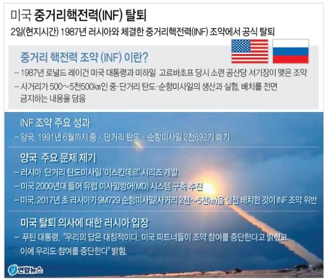 미국이 지난 8월 2일(현지시간) 1987년 러시아와 체결한 중거리핵전력(INF:(Intermediate-Range Nuclear Forces Treaty) 조약에서 공식 탈퇴했다.