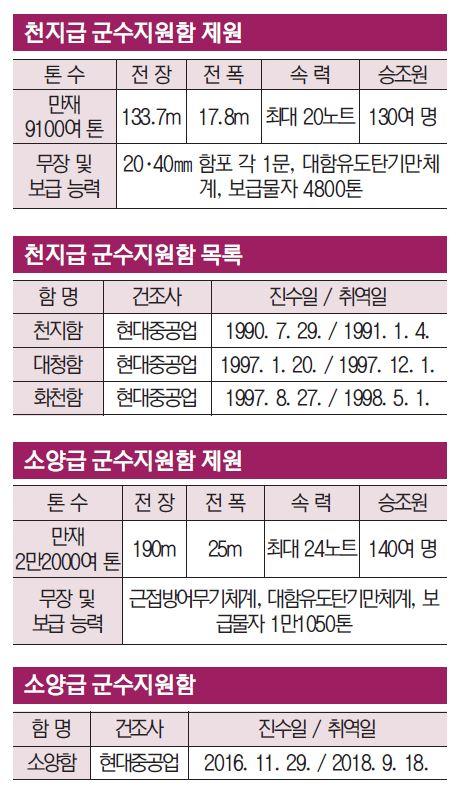 소양급 군수지원함은 전장 199m, 전폭 25m다. 함포는 없지만 근접방어무기체계(CIWS·Closed In Weapon System)와 대함유도탄기만체계를 장착했다. 또 소화방수체계를 보강하고, 이중 선체를 적용해 생존성을 높였다.