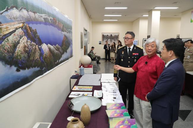 이동호(육군준장·앞에서 셋째) 국방부 고등군사법원장이 지난 20일 법원 내 대법정에서 개최된 ‘열린 군사법원 국악공연 및 5개국 작가 그림전시회’에서 그림을 관람하고 있다. 법원은 71주년 국군의 날을 앞두고 국방부 환경미화 근무원과 장병들을 격려하기 위해 이번 공연과 전시 행사를 개최했다. 조종원 기자