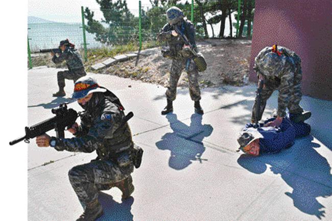 공군방공관제사령부 예하 8215부대가 15일 해병 2956부대와 합동으로 기지방호훈련을 진행한 가운데 장병들이 기지에 침투한 특작군을 격멸하고 있다. 부대 제공