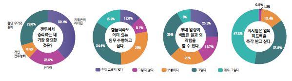 용사들은 ‘전투에서 승리하는 데 꼭 필요한 것’으로 ‘첨단 무기와 장비’(29.6%)보다도 ‘지휘관의 리더십’(39.4%)을 선택했다. 승리의 조건을 ‘전우애’(22.5%)라고 답한 용사도 많았다. ‘지휘관에게 가장 필요한 자질’로는 ‘판단력(34.2%)’을 꼽았고, ‘솔선수범’(28.8), ‘소통’(19.2%), ‘솔직함’(16.4%)이 뒤를 이었다.