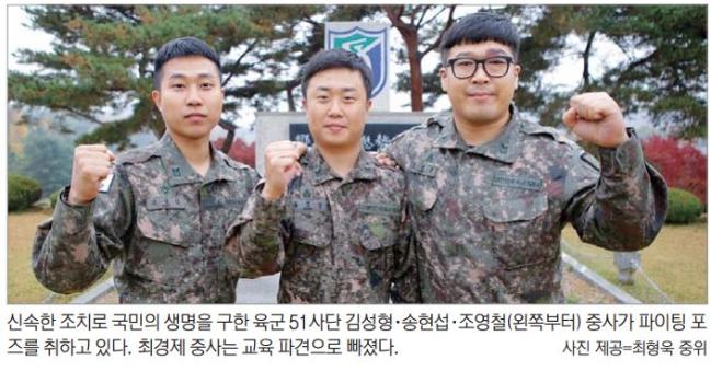 국민의 생명을 구한 육군 장병들의 선행이 잇따라 알려져 귀감이 되고 있다.