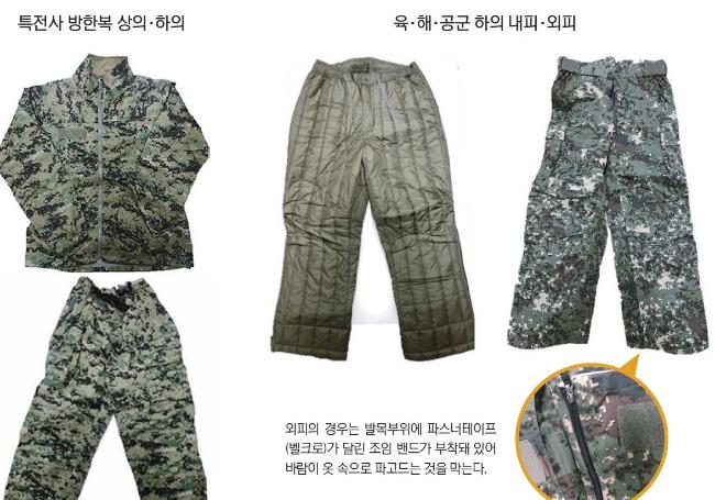 특전사용 기능성 방한복은 내피 상의와 외피 상·하의, 방한 두건, 설상복 상·하의로 구성돼 있다. 또 해병대의 기능성 방한복은 경계용 내피 상의, 혹한용 내피 상의, 혹한용 외피 상·하의, 방한 두건, 설상복 상·하의로 구성된다.
