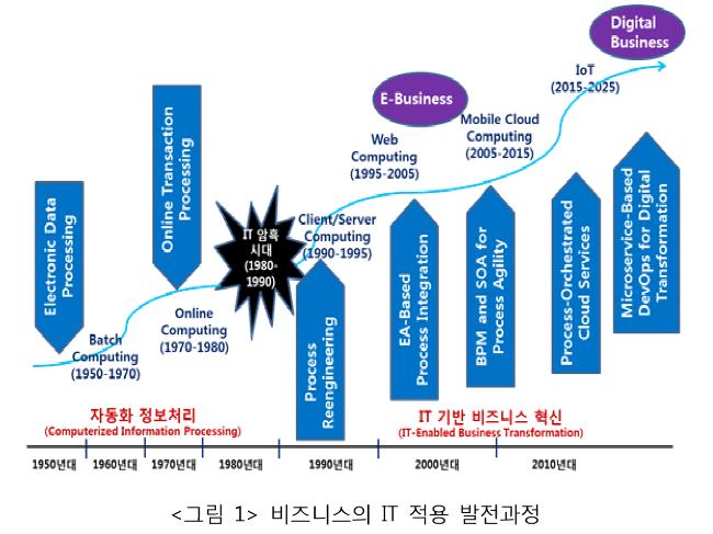BPR은 1990년부터 1995년까지는 클라이언트/서버 컴퓨팅을, 1995년부터 2005년까지는 IT 표준화와 엔터프라이즈 아키텍처(EA: Enterprise Architecture) 기반 프로세스 통합을 통해 E-비즈니스를, 2005년부터 2015년까지는 업무 프로세스 모델(BPM: Business Process Model)과 SOA 기반의 프로세스 통합(Process Orchestration), 그리고 클라우드(Cloud) 서비스를 통해 모바일 클라우드 컴퓨팅을, 2015년부터는 IoT, MSA(Microservice Architecture)와 클라우드 기반의 디지털경제를 가져왔다.