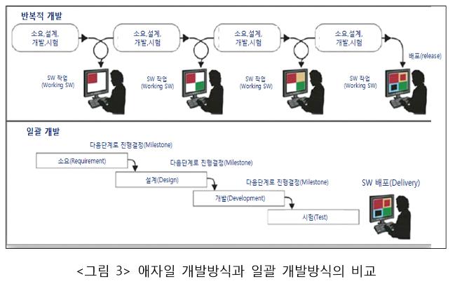 앞에 소개한 것처럼 애자일 개발방식은 소프트웨어 개발 방법론의 하나로 사용자 소요를 반복적으로 반영하고 개발대상을 소규모 배치(batch) 단위로 분할해 하나의 반복주기 내에 설계, 개발, 시험해 통합하는 것이다(<그림 3> 참조). 하나의 반복 기간은 프로젝트마다 다르지만, 일반적으로 1주에서 4주 정도인 경우가 많다. 이 반복 주기를 계속해 나가며 하나씩 배치를 추가 개발하는 것이다.