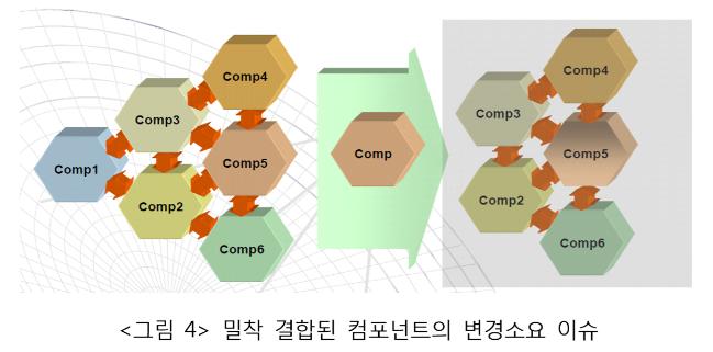 과거의 정보체계는 업무수행을 담당하는 컴포넌트(Comp)가 상세하게 규정된 인터페이스를 통해 상호 단단하게 결합(tightly coupled)되어 있으며, 업무수행 절차에 따라 최적화된 순서로 연결되어 있었다. 그 결과 정보체계는 컴포넌트 하나를 변경할 경우, 다른 수많은 컴포넌트에 영향을 미치게 되었다. <그림 4>는 컴포넌트 1∼6이 밀착 결합된 상태에서 컴포넌트 1의 변경이 요구될 때를 보여주고 있다. 만약 사용자가 새로운 데이터를 요구하면, 새로운 컴포넌트를 추가 또는 기존 컴포넌트를 변경해 관련된 모든 컴포넌트와 결합해야 하는데, 이 작업이 대개 1~2년이 걸리는 상황이었다. 개발자는 새로운 컴포넌트와 기타 컴포넌트에 대해 인터페이스를 개발하고, 이를 통해 데이터가 상호 전송, 공유되는 것을 확인해야 했다.