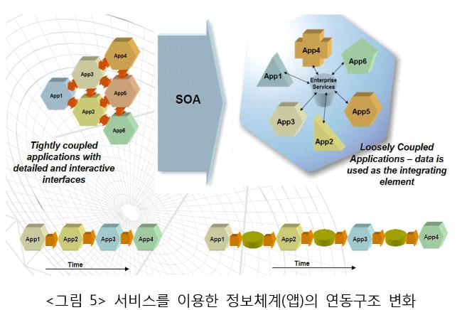 그 결과 컴포넌트로 구성된 정보체계의 소프트웨어, 즉 앱은 <그림 5>의 왼쪽 부분과 같이 물리적 인터페이스 또는 DB 인터페이스를 통해 단단한 결합으로 연동하면서 순차적으로 수행되어야만 한다.