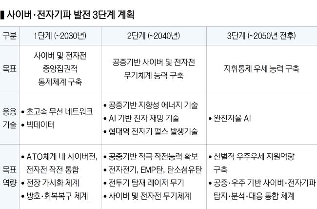 공군은 향후 30년 이상을 조망하며 단계별 사이버전·전자전의 체계 및 능력 구축을 위한 계획 수립을 중요하게 보고 있다. 미래전은 사이버전 능력과 전자전 능력의 상호의존적 운용을 통한 전영역작전에서의 우세 확보가 절실하며, 사이버·전자기파의 제약 없는 활용 역시 중요하게 작용하기 때문이다.
