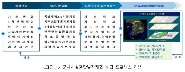 군사시설은 한번 건설되면 거의 30년 동안 유지되는데 그 기능이나 규모를 변경하려면 추가적인 예산소요가 커서 선뜻 실행하기 어렵다. 군사시설의 설치 계획을 수립할 때 시설 건설의 목적에 부합하도록 철저하고 세밀하게 사업을 수립하는 것이 무엇보다 중요하다. 최근의 건설 분야에서는 BIM(Building Information Modeling) 기술이 활용되고 있는데, 3차원 설계를 넘어 시간과 비용을 고려한 시공 및 유지관리까지 시뮬레이션이 가능하다. 이러한 시스템을 활용하면 건설 시공상의 오류를 최소화하고 시간과 비용을 절감해 생산성을 향상시킬 수 있다. 마찬가지로 군에 서도 시설물 정보 및 관리에 대한 정보의 통합·분석체계를 마련하여 인공지능 컴퓨터가 군의 수요를 자동으로 파악하고 부대에서 필요로 하는 시설을 설계하며, 예산의 확보 가능성까지 확인할 수 있어야 한다. 이것이 군사시설종합관리시스템이다. 이를 통해 시설물의 규모, 연한, 건축방식의 정보는 물론, 시설 유지 관리에 필요한 장비, 물자, 인력의 현황 등에 관한 사항을 포괄하여 전자지도(GIS)에 나타낼 수 있다. 이런 정보를 관련 기관이 공유하면 합리적인 의사결정을 할 수 있게 된다. 특히, 시설물의 유지에 필요한 요소인 기후, 지리, 사회기반시설에 대한 정보는 물론 무기체계 전력화계획, 인원 충원계획, 부대 편제 등의 실시간 변동사항을 포함한다면 군사시설과 관련된 자원의 효과적 배분과 경제적 부대운영에 직접적으로 활용할 수 있다. 예를 들어 시스템을 통해 미활용 부지를 식별하여 용도전환을 한다거나, 군사시설 주변지역에 대한 분석을 통해 지역주민과 공동이용이 가능한 복합시설을 설계할 수 있다. 또한 취락지구를 회피하여 훈련 경로를 설정하고, 부대의 개편계획이 변경되는 경우에도 시설의 기능과 역할을 재조정하는 등, 군사시설이 주둔하는데 필요한 요소를 계획단계에서 분석할 수도 있다.
