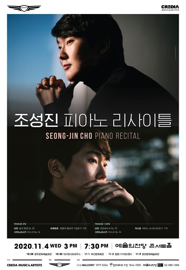 공연기획사 크레디아는 조성진이 오는 28일 광주를 시작으로 대구와 부산, 창원, 서울, 춘천 등 6개 도시에서 리사이틀 투어를 갖는다고 밝혔다. 2018년 국내 리사이틀을 처음 가졌던 조성진은 당초 지난 7월 서울을 비롯해 7개 도시에서 연주를 할 예정이었으나 코로나19 재확산 우려로 모두 취소했다.