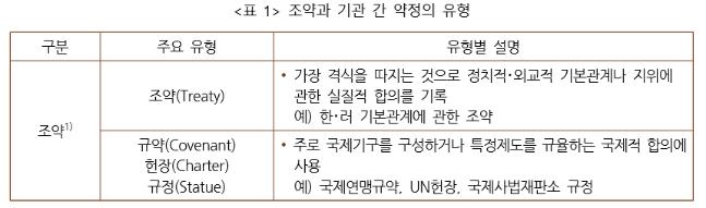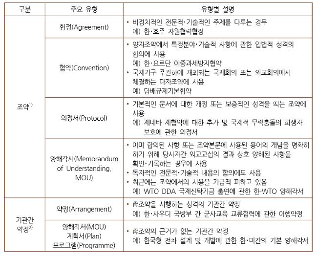 조약은 국가 또는 국제기구 간에 권리와 의무 관계를 맺기 위하여 서면 형식으로 체결되고 국제법에 의해 규율되는 것이다. 통칭해서 조약이라고 하지만 조약, 규약, 헌장, 규정, 협약, 의정서, 양해각서 등이 다양하게 사용되고 있다. 각각의 명칭이 사용되는 명확한 기준은 없지만, 조약체결 관행에 따라 적절한 명칭이 선택된다. 좁은 의미의 조약은 가장 격식을 따지는 정식 문서로서 평화, 동맹, 우호, 방위 등 주로 정치적, 외교적 기본관계나 지위에 관한 포괄적이고 실질적인 합의를 기록하는 것이다. 규약(Covenant), 헌장(Charter), 규정(Statute)은 국제기구 구성, 특정제도 규율의 국제적 합의에 사용되고, 협정(Agreement)은 비정치적, 전문적, 기술적인 주제를 다루는 합의에 사용된다. 협약(Convention)은 특정 분야나 기술적 사항에 관한 입법적 성격의 양국 간 합의 또는 국제기구 주관하에 개최되는 국제회의에서 체결하는 다자조약에 사용된다. 의정서 (Protocol)는 기본 문서를 개정 또는 보충하는 조약에 사용된다. 양해각서(Memorandum of Understanding)는 이미 합의된 내용 또는 조약 본문의 용어 등 상호 양해된 사항을 확인하고 기록하는데 사용되지만, 독자적인 전문적이고 기술적인 내용의 합의를 규정하는 데도 사용된다.