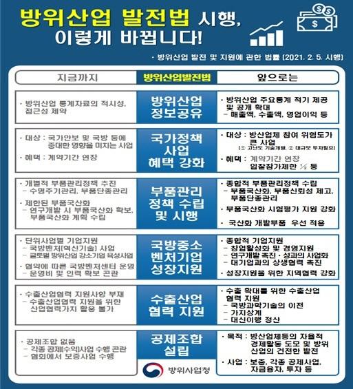 방사청의 혁신은 이미 현재진행형이다. 방사청은 원가·지체상금제도 개선, 신속시범획득사업 추진, 성실수행 인정, 국가정책사업 지정, 방산혁신클러스터 구축 등 기존 방위사업의 패러다임을 전환할 뿐만 아니라 미래를 대비하는 데 있어 꼭 필요한 정책을 추진하고 있다. 특히 방위산업의 도약과 경쟁력 강화를 위해 훈령 등으로 시행됐던 방산 발전 및 지원을 위한 제도들과 신규 제도들을 법률로 발전, 체계화해 이달 중 시행령·시행규칙 등을 확정할 예정이다. 방사청은 이를 통해 방위산업 발전과 지원을 위한 법적 수행근거가 마련되고 실질적인 실행력이 제고될 것을 기대하고 있다. 이제부터 올해 새롭게 시행되는 방위산업 발전 및 지원에 관한 법률을 알아보자.