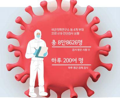 군 중앙역학조사반과 이동 검체 채취팀 운영, 코로나19 진단검사도 빼놓을 수 없는 방대본의 임무다. 군 중앙역학조사반과 이동검체 채취팀은 지난 1년간 출동한 건수가 무려 228건에 이른다. 출동 후 현장에서 보내는 기간을 고려하면 거의 매일 출동한 셈이다. 코로나19 진단검사의 경우 국군의학연구소와 국군수도병원 등 4개 부대를 통해 하루 평균 200여 명의 검체를 검사하고 있다. 수치로는 누적 6만2797건, 검사 받은 사람의 수는 총 8만8626명에 달한다.