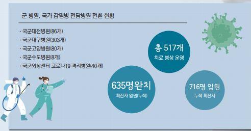 방대본은 군 병원을 국가 감염병 전담병원으로 원활하게 전환하는데도 기여했다. 현재 전환된 국군대전병원(86개), 국군대구병원(303개), 국군고양병원(80개), 국군수도병원(8개), 국군외상센터 코로나19 격리병원(40개)에서는 총 517개의 치료 병상을 운영하고 있다. 지금까지 716명의 확진자가 이들 병원에 입원했으며, 이 중 635명이 완치돼 일상으로 복귀할 수 있었다.