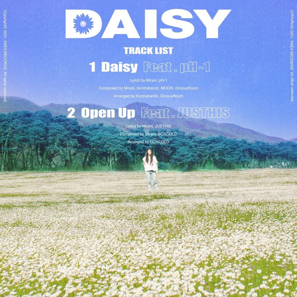 공개된 이미지에는 봄날과 어울리는 데이지 꽃밭에 서 있는 미란이의 모습이 담겨 있다. 밝고 산뜻한 이미지가 그동안 미란이가 보여준 긍정적인 에너지와 잘 어우러진다. 또한 트랙리스트에 따르면 이번 앨범에는 동명의 타이틀곡인 ‘데이지’를 비롯해 ‘오픈 업(Open Up)’까지 총 2곡이 수록된다.