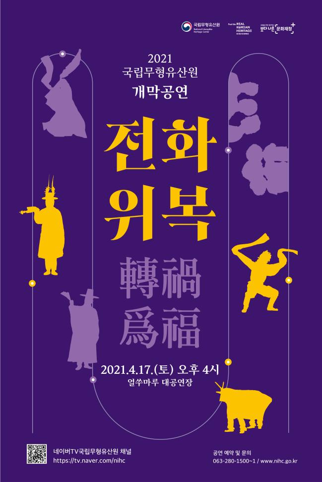 국립무형유산원은 오는 17일 오후 4시부터 전북 전주시 국립무형유산원 얼쑤마루 대공연장에서 2021 국립무형유산원 개막공연 ‘전화위복(轉禍爲福)’을 선보인다.