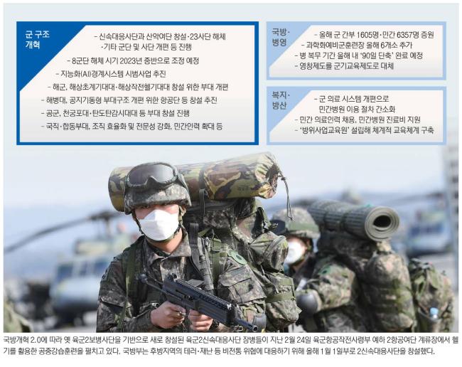 각 군의 부대구조 개편과 관련해 육군은 출생률 저하에 따라 본격적으로 가용 병역자원이 급격히 감소하는 시점을 고려, 부대 구조와 편성을 최적화하고 부대개편 필수전력을 적기에 확보하는 등 전투 효율성을 강화하기 위해 부대구조를 정예화하고 있다고 국방부는 설명했다. 특히 “부대계획의 조정을 통해 부대 수는 줄지만 간부 증원 및 첨단전력 증강과 연계, 구조와 편성의 최적화로 제대별 전투준비태세의 완전성을 강화하는 방향으로 개편을 추진하고 있다”고 부연했다.