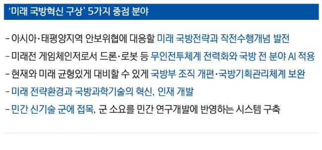 미래 국방혁신 구상은 크게 5가지 중점 분야로 이뤄진다. △아시아·태평양지역의 안보위협에 대응할 수 있는 미래 국방전략과 작전수행개념 발전 △미래전의 게임체인저로서 드론·로봇 등 무인전투체계 전력화와 국방 전 분야에 인공지능(AI) 적용 △국방의 현재와 미래를 균형되게 대비할 수 있도록 국방부 조직 개편과 국방기획관리체계 보완 △미래 전략환경과 국방과학기술의 혁신, 인재 개발 △민간 신기술을 군에 접목하고, 군 소요를 민간의 연구개발에 반영하는 시스템 구축 등이 그것.