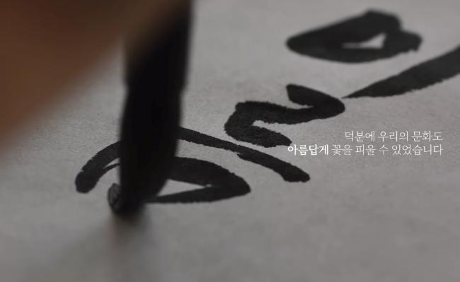 “그대의 자질은 아름답다/그런 사실을 가지고 아무것도 하지 않겠다 해도/내 뭐라 할 수 없지만/그대가 만약 온 마음과 힘을 다해 노력한다면/무슨 일이든 해내지 못하겠느냐/그러니 부디 포기하지 말길.” 한지에 쓰여 있는 내용이다. 두루마리 족자를 만들기 전에 대청마루에 걸어 두었다. 붓글씨가 바람에 마르고 있는 것 같다. 영상이 흐르는 가운데 배우 윤여정 씨가 차분한 목소리로 또박또박 카피를 읽어 내려간다.