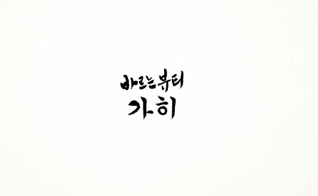 “누구나 쉽게 익히고 쉽게 사용하도록 만들어진 한글. 덕분에 우리의 문화도 아름답게 꽃을 피울 수 있었습니다. 그 마음을 배우며 누구나 쉽게 아름다워지는 세상을 그려봅니다. 기역(ㄱ)부터 히읗(ㅎ)까지, 아(ㅏ)부터 이(ㅣ)까지. 가히. 오늘 한글을 다시 바라봅니다.” 윤여정 씨의 내레이션에 맞춰 한글 자모음이 등장하고, 기역과 히읗 부분과 아와 이 부분을 진하게 강조하니 ‘가히’가 된다. 마지막에 “바르는 뷰티 가히”라는 자막이 나오며 광고가 끝난다. ‘뷰티’라는 영어를 붓글씨로 쓰니 마치 방각본(坊刻本: 조선시대에 민간 출판업자가 영리를 위해 목판으로 간행한 책) 한글소설에 등장하는 글씨처럼 고풍스러운 느낌이 든다.