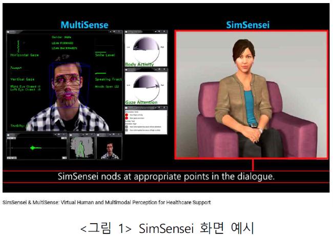 Simsensei는 자연어 기술을 이용하고 비언어적 심리적 행동신호를 감지하는 가상 인간 에이전트로 미군의 정신건강서비스 이용 활성화를 위해 만든 익명성의 웹 기반프로그램이다.