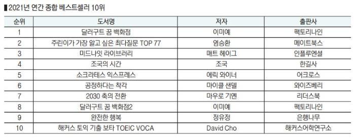 하반기 들어서는 ‘위드 코로나’와 함께 조심스럽게 국내여행이 부각되면서 관련 책의 판매도 늘었다. 교보문고에 여행분야가 생긴 이후 국내 여행 분야가 해외 여행서 판매량을 넘어선 것은 올해가 처음이다. 종합 베스트셀러 100위권 내 분야를 살펴보면 경제경영, 소설 분야가 각각 22종으로 같은 순위를 기록했다. 이어 자기계발이 13종으로 지난해에 비해 다소 주춤했고 인문분야가 11종으로 뒤를 이었다. 한편 전체 도서 매출은 신장한 데 비해 100위권 내 도서의 평균 판매 부수는 전년 대비 2.7% 하락했다. 베스트셀러에 대한 쏠림 없이 많은 도서가 골고루 사랑받았다는 것을 알 수 있다.