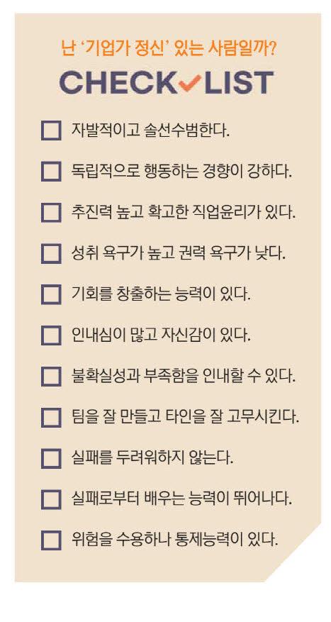 기업가정신 강의로 유명한 미국 뱁슨대학(Babson College)의 제프리 티몬스(Jeffry Timmons) 교수는 기업가정신에 대해 “실질적으로 아무것도 아닌 것으로부터 가치 있는 것을 만들어내는 인간적이고 창조적인 행동”이라고 말했다. 기업가정신이 강한 사람들은 부족한 자원을 고려하지 않고 기회를 추구하며, 비전을 추구할 때 다른 사람들을 이끌 열정을 갖고 있다. 또 계산된 위험을 감수하는 의지를 갖고 누구보다 헌신한다고 했다. 추가로 기업가정신이 많은 사람의 특징을 체크리스트와 같은 항목으로 정리하고 있는데 어느 것 하나 쉬운 것이 없고, 어느 것 하나 중요하지 않은 것이 없다. 이 중 본인이 몇 개에 해당하는지 점검해 보자. 창업에 적합한 사람인지, 기업가정신이 얼마나 있는지 파악할 수 있는 재미있는 경험이 될 것이다.