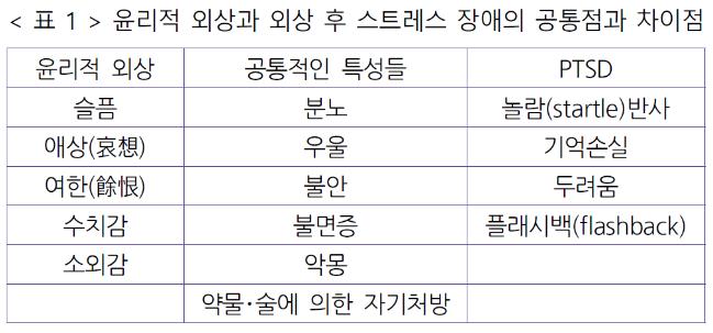 구체적으로 살펴보면, PTSD는 공격의 표적으로서 삶을 위협받는 공격을 받는 현장에 처해 있음으로서 경험하게 된다. 반면에 윤리적 외상은 전투에서 직접적인 행동을 취했을 경우나, 목격했을 시, 자신의 기저 도덕적 신념이 깨어지게 되면서 겪게 되는 인지적 및 정서적인 차원에서의 죄책감과 수치감, 배반감으로 경험된다.