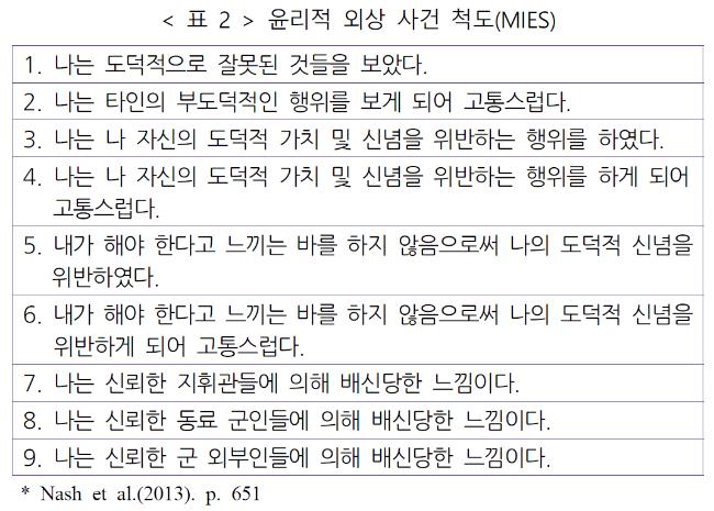 우선 군을 대상으로 하는 ‘윤리적 외상 사건 척도(Moral Injury Events Scale: MIES)’는 9항목으로 구성되어 있으며, 자신과 타인에 의해 부도덕적으로 인지되는 행위 및 배반을 포함하는 전쟁과 연관된 사건들에 대한 내용을 담고 있다(<표 2> 참고).