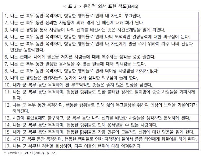 ‘윤리적 외상 표현 척도(Expression of Moral Injury Scale; EMIS)’는 17항목으로 구성되며, 군 복무 경험과 관련하여 자신에 대한 윤리적 외상(self-directed moral injury)과 타인에 대한 윤리적 외상(other-directed moral injury)을 측정한다.