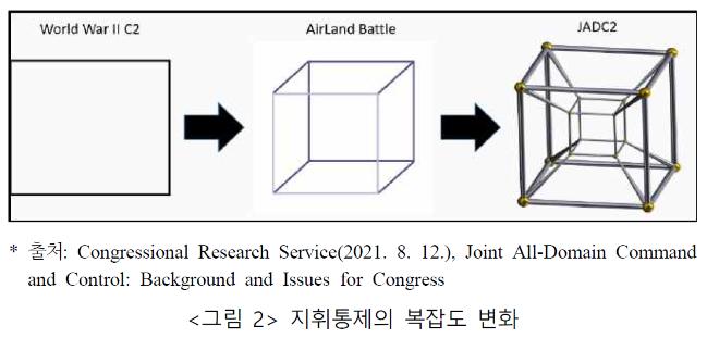 전장 공간이 다영역으로 확장되면서 <그림 2>와 같이 지휘통제의 복잡도가 높아졌고 인공지능과 무인화 기술이 융복합되면서 의사결정의 속도가 작전의 성패를 좌우하게 됨에 따라 JADC2 전략으로의 발전은 필연적인 흐름으로 볼 수 있다.