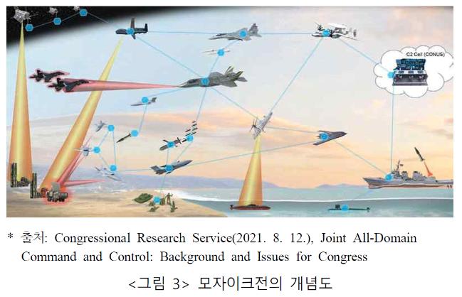 최근 미 전략예산평가센터(CSBA: Center for Strategic and Budgetary)가 발표한 보고서에 따르면 모자이크전은 인간지휘-기계통제(Human Command and Machine Control)를 활용하여 분산된 미군 전력의 신속한 구성과 재구성을 통해 미군에게는 융통성을 제공하는 한편, 적에게는 복잡성과 불확실성을 부여한다고 정의하였다.
