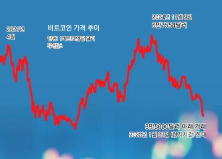 암호화폐 대장주 비트코인 얘기로 돌아가 볼까요. 지난해 11월 6만9000달러에 도달하며 역대 최고치를 찍었던 비트코인은 최근 반 토막이 나며 약세를 보입니다.