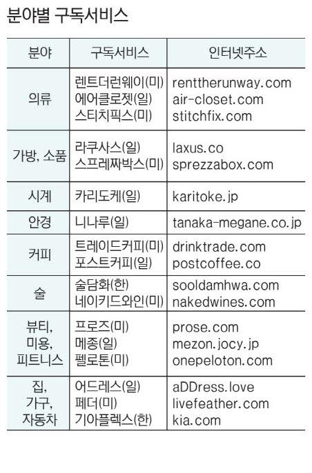 콘텐츠나 소프트웨어는 물론이고 옷, 가방, 액세서리 등 패션 아이템, 이·미용품과 화장품, 시계, 안경, 반려동물용품, 식음료, 주류, 피트니스와 건강식품, 미술품, 통신서비스, 가전, 가구 등 헤아릴 수 없이 많다. 이제 집과 자동차까지 구독한다. 구독할 수 없는 상품이나 서비스를 찾는 것이 더 힘들다.