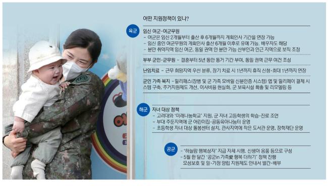 최근 늘어난 난임(불임)치료를 지원하는 인사정책도 만들었다. 육군은 임신을 위한 시술을 원하는 군인·군무원은 근무 희망지역을 우선 분류하기로 했다. 장기간 치료가 필요한 경우에는 1년까지 휴직을 신청한 뒤 최대 1년까지 연장할 수 있도록 했다.