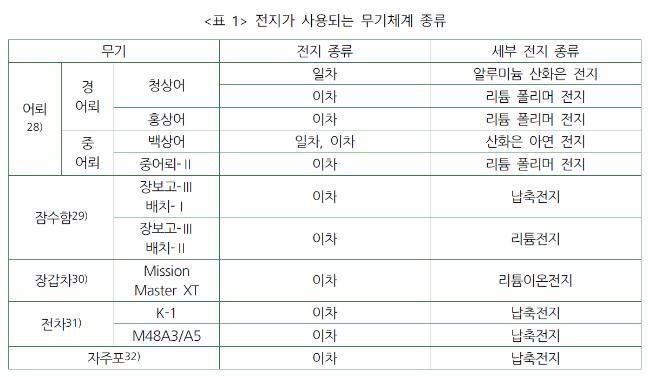 이차전지 기술이 발전함에 따라 산업 전반적으로 사용 가능한 범주가 증가하였다. 특히 군에서는 전지 용량 부족으로 휴대용 무전기 및 보안장비 위주로 사용되었지만, 전지 고밀화가 이뤄짐에 따라 어뢰를 비롯하여 잠수함, 전차 등의 다양한 무기체계 전력원이 이차전지로 대체되기 시작했다(<표 1> 참고). 현재 개발 중이거나 완료된 이차전지 적용 무기체계 사례들을 살펴보자.
